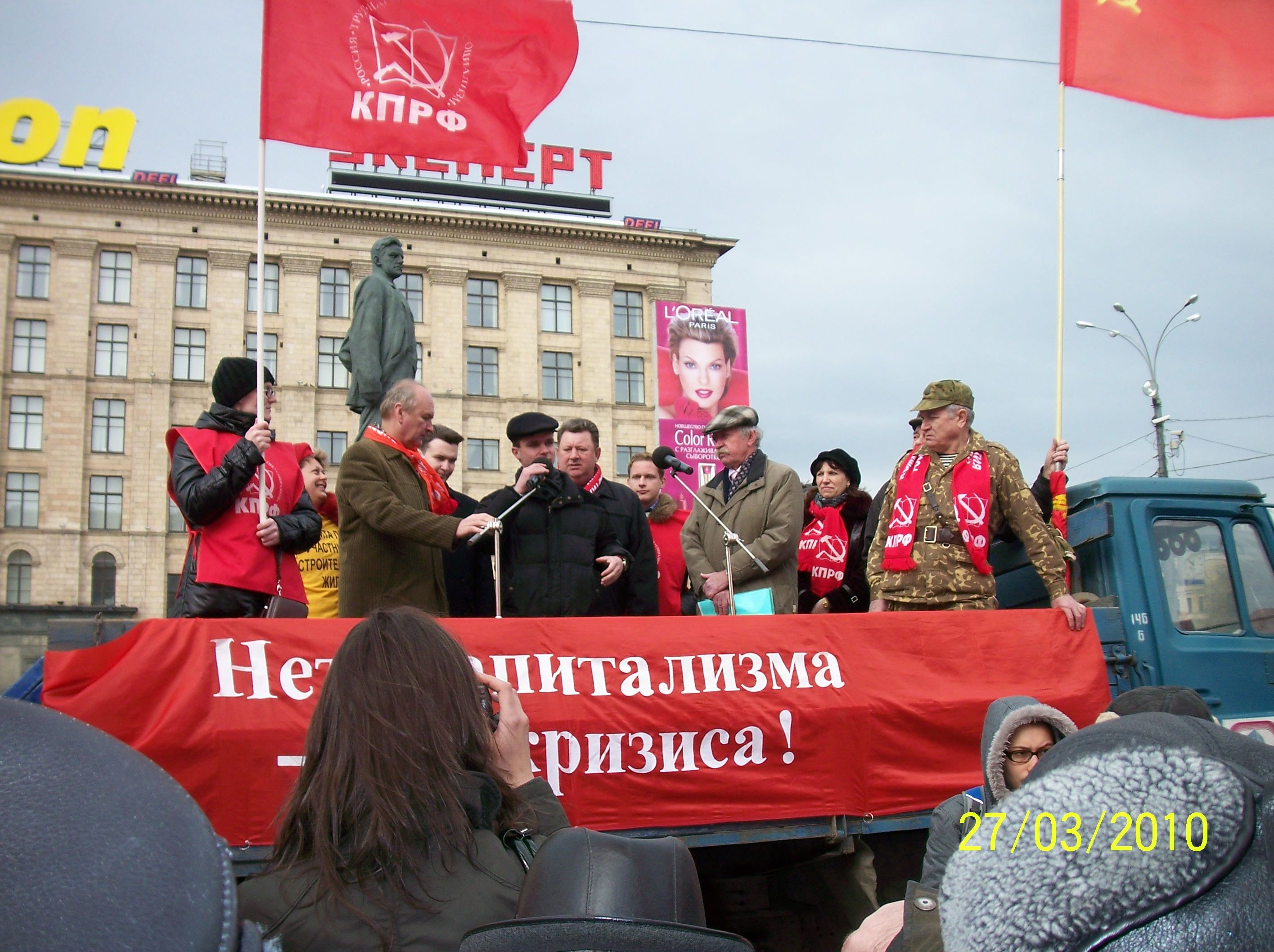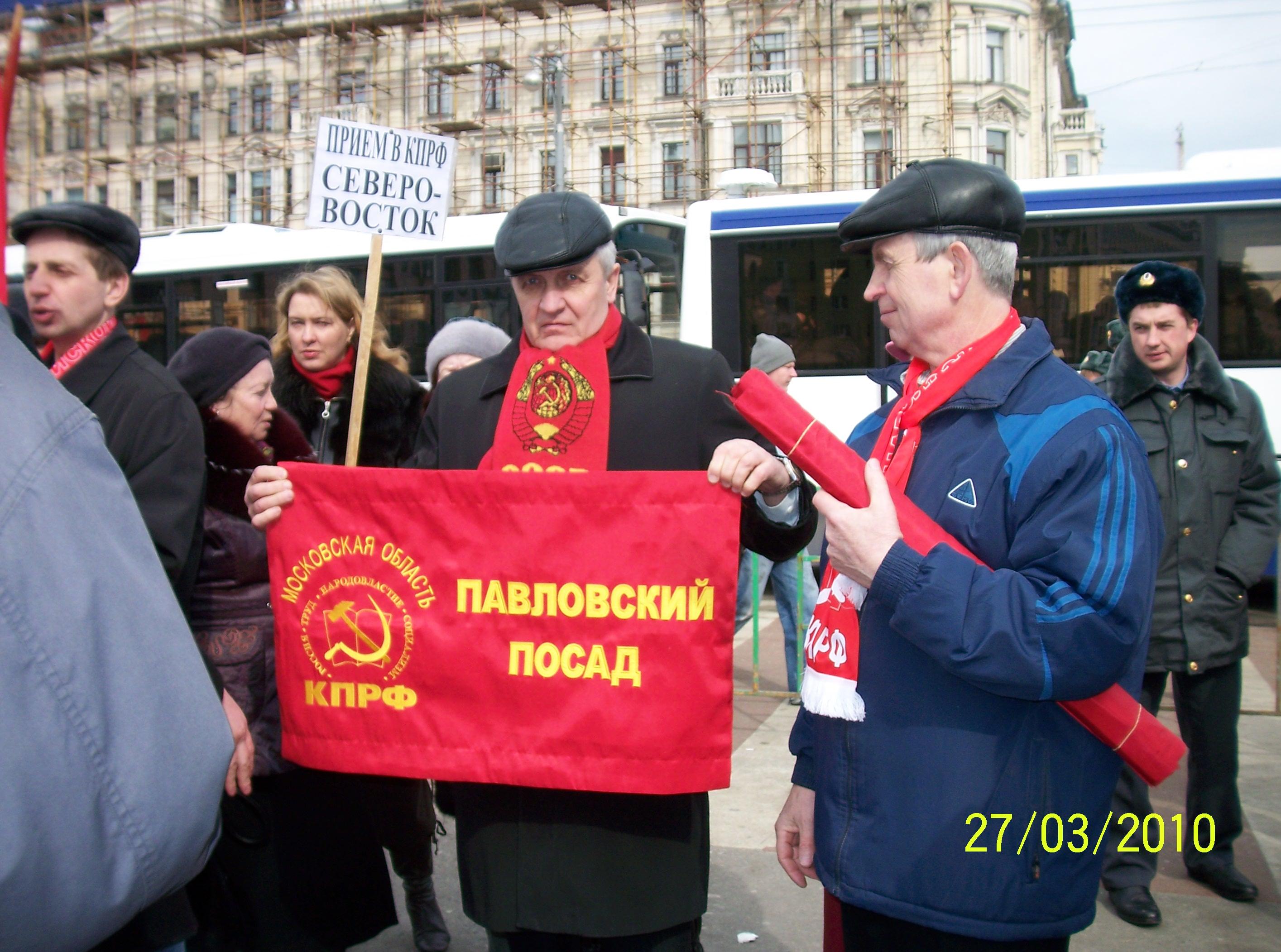 Руслан Тхагушев, Пресс-служба ЦК КПРФ. Фото Александр Крючков ![]() В этот день в столице дул сильный ветер. И особенно по-боевому развевались на нем красные флаги. Протестное настроение словно реяло в воздухе. Среди участников акции – коммунисты Москвы и Подмосковья, комсомольцы, представители Союза Советских офицеров, Движения в поддержку армии, Всероссийского женского Союза «Надежда России». Пришли на митинг со своими транспарантами и обманутые дольщики – несмотря на заверения властей, таких людей становится с каждым годом все больше. Они запустили в московское небо стилизованный дирижабль с требованием к государству обратить внимание на их проблемы. Акция проходила под лозунгами: «Нет капитализма – нет кризиса!» «Антинародное правительство – в отставку!» «Нет!» коммунальному грабежу!» «За антикризисные меры КПРФ». Митинг открыл секретарь МГК КПРФ Александр Потапов. Он отметил, что в стране изменяются часовые пояса, но народ только затягивает пояса. Власти говорят неправду о том, что кризис миновал. Он и не думал заканчиваться. Затем слово было предоставлено заместителю Председателя ЦК КПРФ, руководителю Всероссийского штаба протестных действий В.И. Кашину. Владимир Иванович передал привет от Председателя ЦК КПРФ Геннадия Андреевича Зюганова, который в это время проводил заседание Исполкома СКП КПСС. На этом важнейшем форуме вырабатывалась тактика совместных действий коммунистов из бывших советских республик по подготовке к 65-летию Великой Победы и противодействию наступлению капитала на социальные права граждан. «Сегодняшняя акция свидетельствует о том, что набухает недовольство нашего народа правящим режимом и проводимым им курсом, - обратился к участникам митинга В.И. Кашин. – Мы видим, что рукотворный кризис, в который втянула нас власть, продолжается. Увеличивается безработица, меньше становится доходов у большинства населения страны. Вздуваются цены на товары первой необходимости, лекарства, растут тарифы ЖКХ. Власть разбазарила триллионы народных денег, которые осели в карманах олигархов». В.И. Кашин подчеркнул, что за время правления Путина тарифы на ЖКХ выросли в 10 раз. Хотя еще в 2003 году «Единая Россия» обещала, что они снизятся в 2 раза. Еще одной темой, которую затронул В.И. Кашин, стало возможное участие военнослужащих НАТО в Параде Победы на Красной площади. Заместитель Председателя ЦК КПРФ подчеркнул, что сегодня в Европе раздувается русофобия. Советскую страну пытаются поставить на одну доску с Гитлером. Фашистские недобитки маршируют по улицам городов Прибалтики. В таких условиях участие НАТОвцев в Параде Победы является кощунственным, и коммунисты приложат все усилия, чтобы не допустить этого надругательства над нашими святынями. В.И. Кашин отметил, что выход страны из тупика возможен только на основе антикризисной программы КПРФ. Но для того, чтобы она была реализована, необходима мощная народная поддержка. «Если на улицы выйдут хотя бы 15-17% взрослого населения, то даже ОМОН и милиция вольются в наши ряды!», - подчеркнул заместитель Председателя ЦК КПРФ. Руководить фракции КПРФ в Московской городской думе Андрей Клычков в своем выступлении отметил, что программа правительства – это виселица, которая действует в интересах избранной группы олигархов и коррумпированных чиновников. Между тем