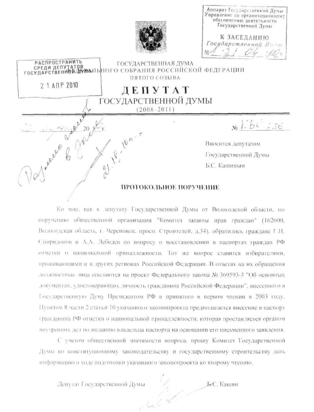 На пленарном заседании Государственной Думы 21 апреля депутат фракции КПРФ Б.С. Кашин обратился с протокольным поручением по вопросу восстановления в паспорте отметки о национальной принадлежности. ПРОТОКОЛЬНОЕ ПОРУЧЕНИЕ Вносится депутатом Государственной Думы Б.С. КашинымКо мне, как к депутату Государственной Думы от Вологодской области, по поручению общественной организации "Комитет защиты прав граждан" (162600, Вологодская область, г. Череповец, просп. Строителей, д.34), обратились граждане Г.Н. Спиридонов и Л.А. Лебедев по вопросу о восстановлении в паспортах граждан РФ отметки о национальной принадлежности. Тот же вопрос ставится избирателями, проживающими и в других регионах Российской Федерации. В ответах на их обращения должностные лица ссылаются на проект Федерального закона № 369593-3 "Об основных документах, удостоверяющих личность гражданина Российской Федерации", внесенного в Государственную Думу Президентом РФ и принятого в первом чтении в 2003 году. Пунктом 8 части 2 статьи 10 указанного законопроекта предполагается внесение в паспорт гражданина РФ отметки о национальной принадлежности, которая проставляется органом внутренних дел по желанию владельца паспорта на основании его письменного заявления. С учетом общественной значимости вопроса, прошу Комитет Государственной Думы по конституционному законодательству и государственному строительству дать информацию о ходе подготовки указанного законопроекта ко второму чтению. Депутат Государственной Думы Б.С. Кашин Источник: kprf.ru