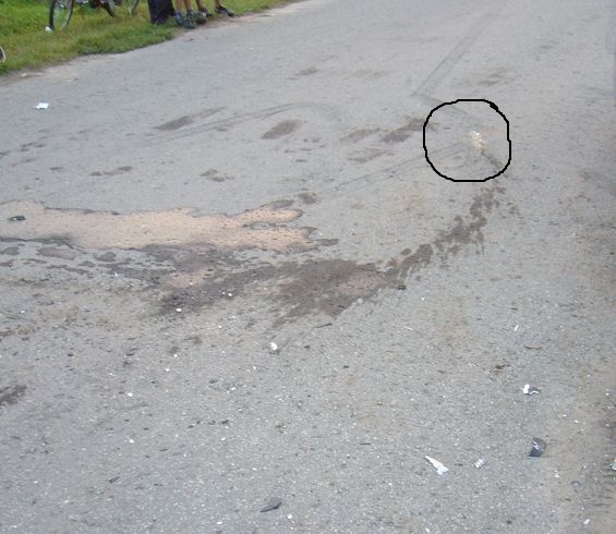 Версия такая - водитель ВАЗ привысил скорость на небольшом повороте дороги (виден на фото) не справился с управлением или был не внимателен и выехал на встречную часть дороги - об этом говорят следы торможения. Следы антифриза говорят о том, что столкновение произошло в полосе движения иномарки. |