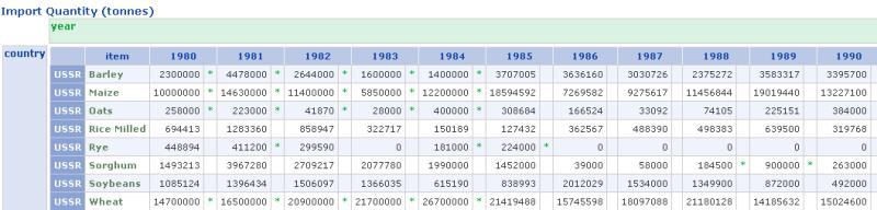 дисс Я Вам ещё раз повторю . Нет ничего зазорного в импорте , если он гораздо эффективней , чем если импортный продукт производить у себя . Не выращивали же мы , в конце концов , кофе ! И правильно делали . И сейчас правильно делаем , что не выращиваем . Но если Вы решили ввести в заблуждение своих товарищей по поводу "фуражности" зерна , то напомню Вам , что львиную долю в импорте зерновых составляла пшеница . Вот , например , импорт зерновых c 1980 по 1990 . Barley - ячмень ; Maize - кукуруза ; Oats - овёс ; Rice Milled - обмолоченный рис ; Rye - рожь ; Sorghum - сорго ; Soybeans - соя ; Wheat - пшеница .