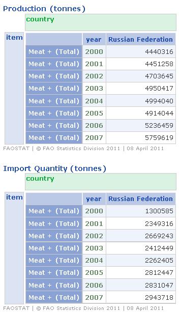 Дисс, только что-то в провициальных магазиных этого чудесного советского мяса было днем с огнем не сыскать, видимо в 10миллион тонн мяса включались рога, копыта, шкуры и прочие побочные продукты вкупе с приписками, как в старом советском анедоте про то, как одна выращенная свинья в отчетах превратилась в пять свиней, потом реально выращенную свинью отправили в помощь польским рабочим, а четыре остальных - в советские магазины. А, в очередной раз, изволю напомнить, что на срочной службе на ТОФе в 1984-86 годах родная страна кормила воинство обнюдь не " своим экологически чистым мясом" а мясом из Новой Зеландии и Австралии.