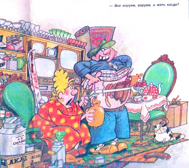 Краткая характеристика воровства приблизительно такая: у одних не хватает ума минимизировть потуги к воровству, у других не хватает ума не создавать потребность в воровстве, у третьих не хватает ума качественно воровать. Чаще всего осуждается не факт, а его известность, (как супружеская измена) PS Рекомендую, прошу, настаиваю: прекратите гадания по поводу качеств собеседника. Особенно в целях доминирующего возвышения собственной персоны. занимайтесь делом. Мы здесь ищем решение важных проблем в обществе, как бы это излишне патетически не звучало.. Последний раз редактировалось Борис Кирпиченко; 26.01.2011 в 08:13. |