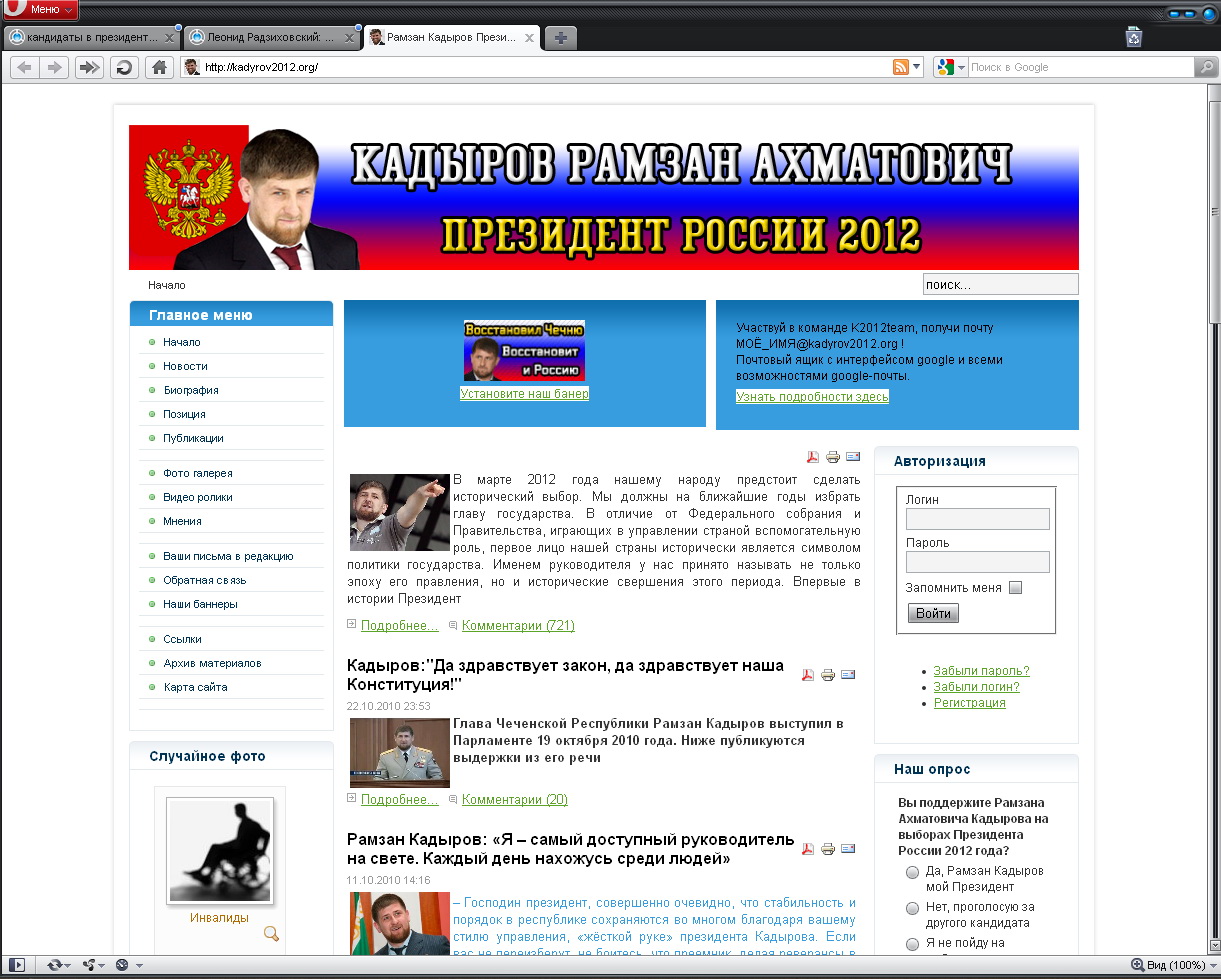 Современные политологи обсуждают: кому же достанется президентское кресло по результатам следующих выборов? Как-никак осталось два года – срок крохотный, и определяться уже сейчас. Политологи пока традиционно разрываются между кандидатурами Путина и Медведева, но некоторые граждане думают, что возможен еще и третий вариант. Инициативная группа создала веб-сайт в поддержку одного из возможных кандидатов – http://kadyrov2012.org Я считаю, что это разумный выбор каждого здравомыслящего россиянина. Начну несколько издалека. Не так давно бурные споры среди россиян вызвало выделение из Южного Федерального округа структурной единицы – Северо-Кавказского округа, куда полномочным представителем Президента России был направлен экс-губернатор Красноярщины Хлопонин. Высказывались совершенно фантастические предположения о таких структурных пертурбациях, но наиболее приближенной к жизни является следующая: Как известно, Кавказ – один из самых динамично развивающихся регионов России. Еще вчера там по горам бегали бородатые моджахеды; еще вчера там торговали так называемыми «чеченскими авизо» и краденой нефтью; еще вчера столица республики город Грозный выглядела лесом разбитых высоток, земля была покрыта многосантиметровым слоем кирпича и щебня, оставшегося после артналетов. А что мы видим сейчас? Чистые ухоженные улицы. Работящий народ. Негде не видно пьяных. Разрушенные города практически полностью отстроены. Построена и функционмрует крупнейшая в Европе мечеть. С 2007 года из аэропорта Грозного летают международные рейсы. Зоопарк, созданный с нуля лично Рамзаном Кадыровым дает приют редким и исчезающим видом. Недавно стали осваивать инвестиции на создание туристической инфраструктуры. На фоне этого успеха достижения остальной страны, несмотря на мудрое руководство, следование мудрому Плану Путина и Проекту модернизации Медведева кажутся мелкими и непринципиальными. Так что в выделении Кавказа в отдельный регион есть только один смысл: создание образцово-показательного региона, своеобразной «доски почета» на которую нужно равняться всей стране. В том числе и региональным политикам. Недаром первым полпредом в СКФО был назначен губернатор Красноярского края Александр Хлопонин, который не смог в форсированные сроки достроить такой важный объект как Богучанская ГЭС, в котором так нуждается страна, лишившаяся гиганта Саяно-Шушенки. Опять же: в эпоху всемирного финансового кризиса месторождения в Красноярском крае, этом складе природных ресурсов, практически не разведываются. А это могло бы финансово поддержать экономику страны. Вот и отправили Хлопонина на Кавказ – пройти мастер-класс эффективного управления: посмотреть, поучиться, «пройти практику». С большой уверенностью можно сказать, что переняв кавказский опыт Хлопонин себя еще покажет в самых ответственных местах: на колымских лесозаготовках например. Итак, Кавказский Федеральный округ ныне, - это учебный центр для российских регионалов. Время обучения Хлопонина пройдет, на Кавказ стажироваться отправят кого-нибудь другого. Выучится второй, - отправят третьего на постижение эффективных кавказских управленческих технологий. Но спрашивается, зачем же создавать такие трудности, если можно пойти более простым путем: допустить эффективных кавказских управленцев 