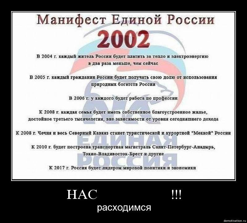 Реальный манифест был принят ЕР перед выборами в думу 2003 года, и он совсем другой. Там никаких хлестаковских обещаний нет. Принимался он на съезде партии. |