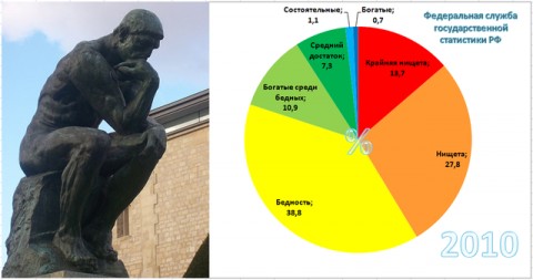 – с доходом ниже 3422 руб. в месяц (т.е. в крайней нищете) живут 13,4% населения; – с доходом от 3422 до 7400 руб. в месяц (в нищете) живут 27,8% населения; – с доходом от 7400 до 17 000 руб. в месяц (в бедности) живут 38,8% населения; – 10,9% населения с доходом от 17 000 до 25 000 руб. в месяц можно назвать «богатыми среди бедных»; – на уровне среднего достатка – с доходом от 25 000 до 50 000 руб. в месяц – живут 7,3% населения; – к числу состоятельных относятся граждане с доходом от 50 000 до 75 000 руб. в месяц. Их число составляет 1,1% населения России; – т.н. «богатые» составляют 0,7% населения. Их доходы оцениваются свыше 75 000 рублей в месяц. Если суммировать приведённые выше показатели, то нетрудно убедиться, что первые три группы граждан (условно можно назвать эту категорию «бедными») составляют почти 80% населения современной России, что составляет почти 113 млн. человек. «Часть населения, бесспорно, является аутсайдерами, а часть – не просто лидерами, а лидерами на фоне архибогатых стран. Так, по подсчётам чиновников, доходы самых бедных и самых богатых жителей нашей страны могут различаться в 800 раз!» – сделал неутешительный вывод глава Росстата Александр Суринов. 80% населения современной России в ЖОПЕ. |
