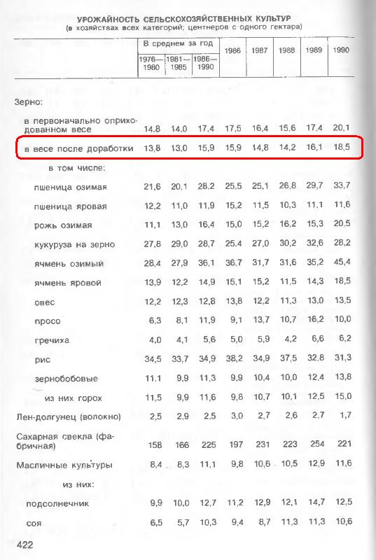 Зерновых за последнюю пятилетку в РСФСР в среднем собирали по 105 млн тонн (в СССР - 200-220 млн тонн!!!), а дерьмократы за последние 19 лет только 2 раза сумели обеспечить валовый сбор в стране более 100 млн тонн!!!
