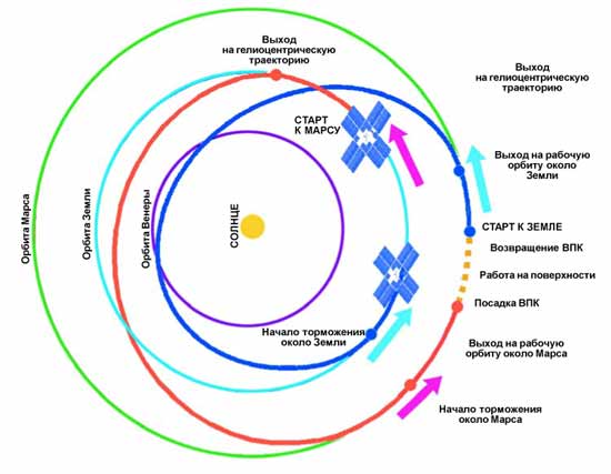 Полет произойдет следующим образом. За несколько месяцев комплекс соберут, и межпланетная экспедиция по гелиоцентрической орбите перелетит в окрестности Марса. Так как опускать весь межпланетный корабль на поверхность Марса нецелесообразно, в составе комплекса будет взлетно-посадочный модуль. После выхода межпланетного экспедиционного комплекса на круговую орбиту вокруг Марса в нем экипаж или его часть совершит посадку на поверхность планеты. После окончания работы на поверхности космонавты вернутся на корабль. Межпланетный экспедиционный комплекс стартует с околомарсианской орбиты к Земле и выйдет на орбиту, с которой стартовал к Марсу. На корабле возвращения экипаж спустится на Землю.