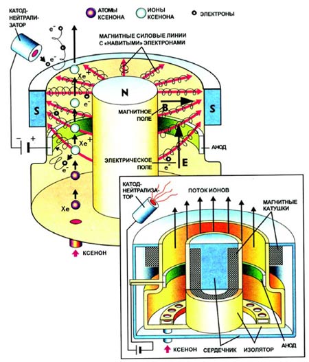 Принцип работы электроракетных двигателей заключается в том, что реактивная струя, обеспечивающая тягу, создается не вследствие теплового расширения газа, как в жидкостных ракетных двигателях (ЖРД), а с помощью разгона ионизированного газа в электромагнитном поле, создаваемом бортовой электростанцией. Топливом, а точнее, "рабочим телом" станет газ ксенон.