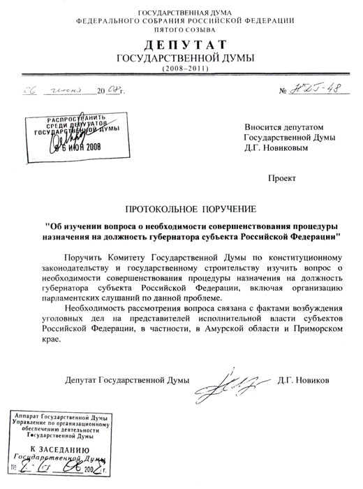 Д.Г. Новиков (фракция КПРФ): "Поручить Комитету Государственной Думы по конституционному законодательству и государственному строительству изучить вопрос о необходимости совершенствования процедуры назначения на должность губернатора субъекта Российской Федерации, включая организацию парламентских слушаний по данной проблеме. Необходимость рассмотрения вопроса связана с фактами возбуждения уголовных дел на представителей исполнительной власти субъектов Российской Федерации, в частности, в Амурской области и Приморском крае". Источник: kprf.ru
