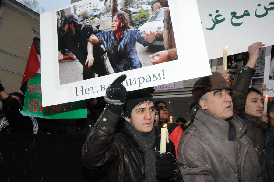 В руках у людей транспаранты: «Нет сионистской бойне в Газе!», «Капитализм – причина войн!», «Остановить вандализм на Святой Земле!», «Спасите детей Палестины!», «Ольмерт, Ливни, Барак – военные преступники!».
